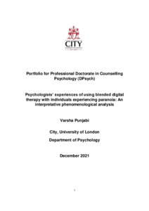 Punjabi, V. (2021). Psychologists’ experiences of using blended digital therapy with individuals experiencing paranoia: An interpretative phenomenological analysis. (Unpublished Doctoral thesis, City, University of London)