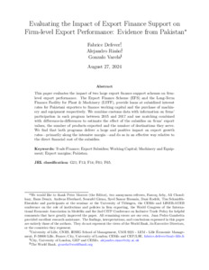 This paper evaluates the impact of two large export finance support schemes on firm-level export performance. The Export Finance Scheme (EFS) and the Long-Term Finance Facility for Plant & Machinery (LTFF), provide loans at subsidized interest rates for Pakistani exporters to finance working capital and the purchase of machinery and equipment respectively. We combine customs data with information on firms’ participation in each program between 2015 and 2017 and use matching combined with difference-in-differences to estimate the effect of the subsidies on firms’ export values, the number of products exported and the number of destinations they serve. We find that both programs deliver a large and positive impact on export growth rates—primarily along the intensive margin—and do so in an effective way relative to the direct financial cost of the subsidies.