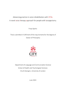 Sparks, F. (2024). Advancing practice in voice rehabilitation with VITAL: A novel voice therapy approach for people with laryngectomy. (Unpublished Doctoral thesis, City St George’s, University of London)