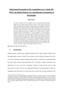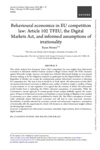 This article analyses how EU competition law uses insights from behavioural economics to determine whether business conduct is illegal. Various Article 102 TFEU decisions against Microsoft, Google, Amazon, and Apple have reflected behavioural findings on non-rational decision-making, as do obligations imposed on gatekeepers by the Digital Markets Act (DMA). Regardless of whether one accepts the underpinning analysis, behavioural economics is informing EU competition law. The issue is how it should do so. Both Article 102 enforcement and the DMA incorporate behavioural economics in different ways, neither of which is simply a corollary of being “ex post antitrust” or “ex ante regulation”. It is argued that the certainty of Article 102 enforcement would benefit from replicating the DMA’s informed assumptions of irrationality. While the Commission’s current approach of context-specific factual analysis when applying Article 102 faithfully captures the contingency of biases in behavioural economics and facilitates accurate outcomes, it has resulted in uncertainty as to when conduct is prohibited. The DMA’s assumptions of irrationality admittedly distort behavioural economics and will produce some inaccurate outcomes. Nevertheless, if suitably informed by research and enforcement experience, assumptions of irrationality offer the opportunity for Article 102 decisions to reflect behavioural insights without abandoning legal certainty.