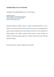 This paper introduces the concept of symbolic rule of law promotion, which consists of repeated enactments of policy and initiatives equated with advancing the rule of law despite no evidence suggesting actual progress. To demonstrate its existence, US rule of law promotion in Afghanistan is examined as a ‘least likely’ crucial case, from the end of President Obama’s Surge in 2014 to the Taliban’s return in 2021. During this time, Afghanistan–a major foreign policy priority–received the most US rule of law aid of any country globally. Unlike earlier attempts that sought to use rule of law policy and practice to achieve substantive goals and adapted over time, US rule of law endeavors from 2015 to 2021 were symbolic. Decisionmakers consistently pursued rule of law strategies and practitioners implemented initiatives that lacked any prospect of success. Previously unsuccessful strategies and programming were replicated alongside partnerships with disinterested, uncooperative stakeholders. More broadly, symbolic rule of law promotion has potentially significant implications for understanding the persistence of underperforming long-term rule of law efforts elsewhere. To increase the prospects of success, it shows the need to engage with non-state justice authorities, support robust accountability mechanisms, and take concerns about state legitimacy seriously.
