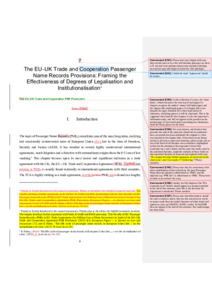 This chapter explores descriptively the recent evolution of PNR law in EU external relations law, evolving into a trade agreement, with a plethora of new actors and 83oversight provisions through the framing of this evolution as degrees of legalisation and institutionalisation. Oversight is a key means to examine these developments, as one of the most important legal issues arising in EU law for PNRs in this period. It considers legalisation in section II, situating PNRs as an evolution of the AFSJ through law initially, moving now in the TCA into a trade agreement. Section III, on institutionalisation, sets out the many actors involved in PNRs oversight, and section IV discusses the early outcomes of that oversight, which appear to indicate unimpressive effectiveness, despite the many layers of governance (which are also non-transparent and difficult to decipher). The chapter concludes, in section V, that PNRs law generally appears to have many shortcomings that are not easily remedied or ameliorated by the TCA, however significant their presence there might be