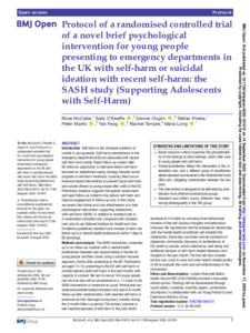 Protocol of a randomised controlled trial of a novel brief psychological intervention for young people presenting to emergency departments in the UK with self-harm or suicidal ideation with recent self-harm: the SASH study (Supporting Adolescents with Self-Harm).