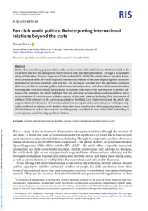 Rather than considering popular culture in the service of states, this article directs attention instead to the social level and how fan clubs pursue their own non-state international relations. Through a comparative study of Tottenham Hotspur Supporters’ Clubs and the BTS ARMY, the article offers a tripartite framework for analysis of the previously neglected international relations of fan clubs, unpacking their distinctive transnational practices, identities, and activism. The discussion considers how fan clubs have developed their own parallels to interstate politics in their transnational practices, and advanced alternative identities rejecting state-centric territorial demarcations. In contrast to accounts of the reproduction in popular culture of elite narratives, the article highlights how fan clubs may serve to reframe and reorient from below representations of even the most exclusive aspects of interstate relations including their instruments of violence. With reference to the common case study of the Black Lives Matter movement, the article also unpacks distinctive dynamics of transnational activism among fan clubs, elaborating how techniques originally mobilized in relation to the fandom object have been transferred to address global political issues. The limitations to each of these aspects are subsequently considered in view of fan clubs’ embedding in contemporary capitalist and geopolitical relations.