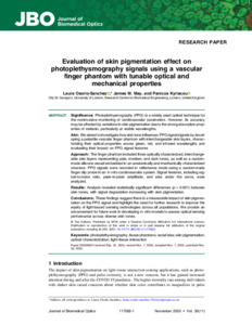 Evaluation of skin pigmentation effect on photoplethysmography signals using a vascular finger phantom with tunable optical and mechanical properties.