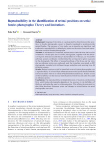The reproducibility in the identification of locations on the retina from serial fundus photographs depends on the accuracy in the definition of the fovea and optic disc used as reference points. This affects the potential for describing locations, distances, areas and changes in retinal lesions on serial photographs over time.