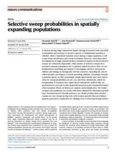 Evolution during range expansions shapes biological systems from microbial communities and tumours to invasive species. A fundamental question is whether, when a beneficial mutation arises during a range expansion, it will evade clonal interference and sweep to fixation. However, most theoretical investigations of range expansions have considered regimes in which selective sweeps are effectively impossible, while studies of selective sweeps have assumed constant population size or ignored spatial structure. Here we use mathematical modelling and analysis to investigate selective sweep probabilities and timings in biologically relevant scenarios, including the case in which mutants can displace a slowly spreading wildtype. Assuming constant expansion speed, we find surprisingly simple approximate and exact expressions for sweep probabilities in one, two and three dimensions, which are independent of mutation rate. Agent-based simulations confirm that our predictions are accurate for the spatial Moran process and remain informative when mutation effects on fitness are random and multiplicative. We further compare and synthesise our results with those obtained for alternative growth laws. Parameterised for human tumours, our model predicts that selective sweeps are rare except during early solid tumour growth, thus providing a general, pan-cancer explanation for findings from recent sequencing studies.